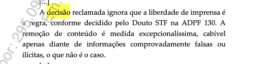 Na peça apresentada ao STF, a defesa demonstrou que a decisão da Justiça estadual contrariava diretamente a jurisprudência da Suprema Corte e impunha sanções desproporcionais contra um veículo de comunicação.