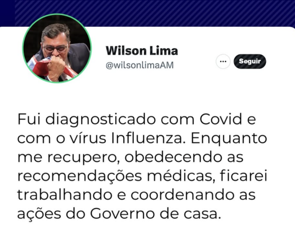 Manaus – O governador do Amazonas, Wilson Lima, anunciou nesta terça-feira (1/4) que foi diagnosticado com Covid-19 e também com o vírus Influenza. Em uma publicação feita em suas redes sociais, ele informou que está bem e que seguirá trabalhando remotamente enquanto se recupera, respeitando as orientações médicas.