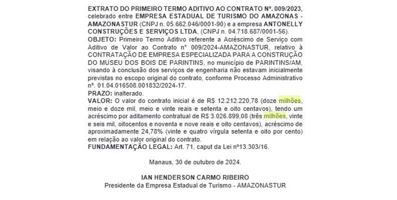 Amazonas – A construção do Museu dos Bois-Bumbás, em Parintins, tem gerado discussões acaloradas desde que, no final de outubro, o governo do Amazonas anunciou a contratação da empresa Antonelly Construções e Serviços LTDA para executar a obra, com um valor inicial de mais de R$ 12 milhões. Contudo, mesmo assim, o orçamento foi ampliado em mais de R$ 3 milhões, elevando o custo total da obra para mais de R$ 15 milhões. A contratação foi formalizada pelo presidente da Empresa Estadual de Turismo (AMAZONASTUR), Ian Henderson Carmo Ribeiro.