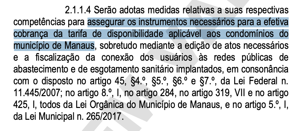 “2.1.1.4 Serão adotadas medidas relativas a suas respectivas competências para assegurar os instrumentos necessários para a efetiva cobrança da tarifa de disponibilidade aplicável aos condomínios do município de Manaus, sobretudo mediante a edição de atos necessários e a fiscalização da conexão dos usuários às redes públicas de abastecimento e de esgotamento sanitário implantados, em consonância com o disposto no artigo 45, §4.º, §5.º, §6.º e §7.º, da Lei Federal n. 11.445/2007; no artigo 8.º, I, no artigo 284, no artigo 319, VII e no artigo 425, I, todos da Lei Orgânica do Município de Manaus, e no artigo 5.º, I, da Lei Municipal n. 265/2017”.