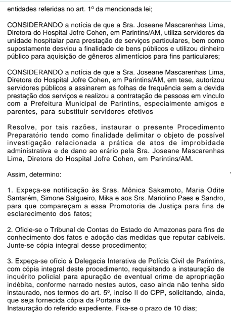 No Diário Oficial do MPAM dessa sexta-feira (5), veio a público a Portaria de instauração do procedimento, que investigará uma denúncia de que Joseane “autorizou servidores públicos a assinarem as folhas de frequência sem a devida prestação dos serviços e realizou a contratação de pessoas sem vínculo com a Prefeitura Municipal de Parintins, especialmente amigos e parentes, para substituir servidores efetivos”.