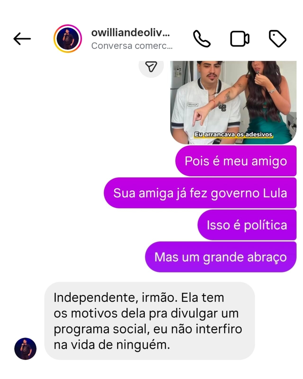 A revelação colocou em xeque o discurso de independência defendido por William. Ao ser questionado por um seguidor, o humorista disse que Carla “tem os motivos dela” para receber dinheiro do Governo Federal.