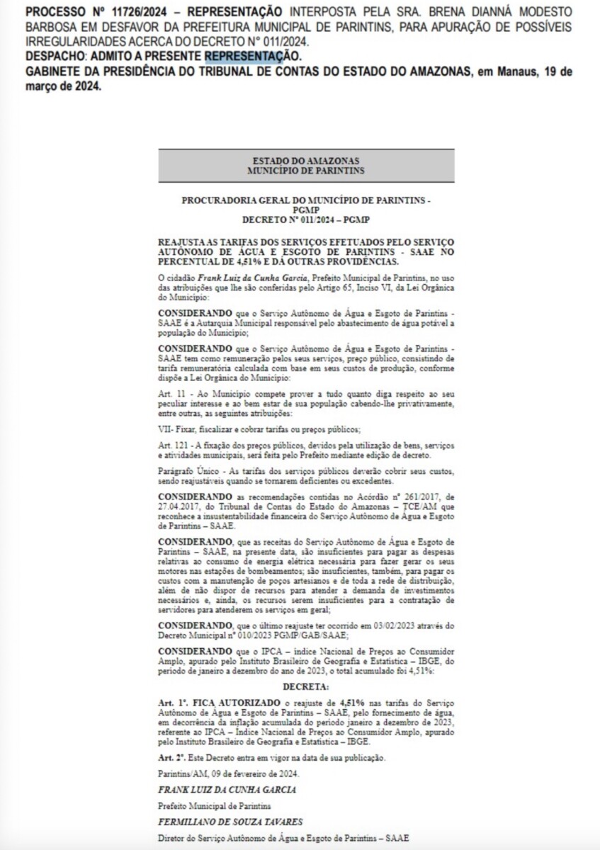 Amazonas – O prefeito de Parintins, no interior do Amazonas, Bi Garcia, está sendo investigado pelo Tribunal de Contas do Estado do Amazonas (TCE-AM), após assinar o decreto nº 011/2024, permitindo o aumento da tarifa de água no município pelo Serviço Autônomo de Água e Esgoto (SAAE).