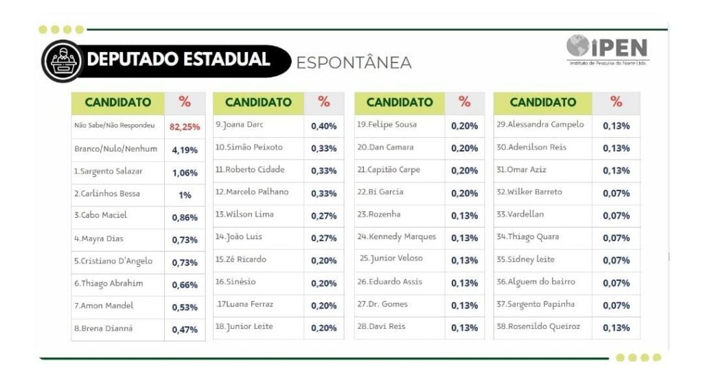 Entre os nomes mais lembrados, o vereador de Manaus Alexandre Salazar, conhecido como Sargento Salazar, aparece na liderança com 1,06% das intenções de voto. Apesar do percentual aparentemente baixo, o resultado reflete a forte pulverização característica das disputas proporcionais e o grande número de indecisos neste momento do processo eleitoral.