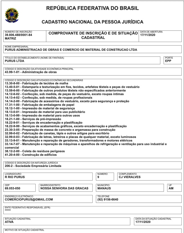A Purus Administração de Obras e Comércio de Material de Construção LTDA, apesar de seu nome indicar um foco na administração de obras, tem um portfólio diversificado que inclui a fabricação de tecidos de malha, estamparia e confecções, comércio atacadista de equipamentos de informática, bebidas, lubrificantes, frutas, carnes, lavagem de veículos e muito mais. Essa diversidade de atividades levanta questões sobre a expertise da empresa em empreendimentos de pavimentação e construção de calçadas.