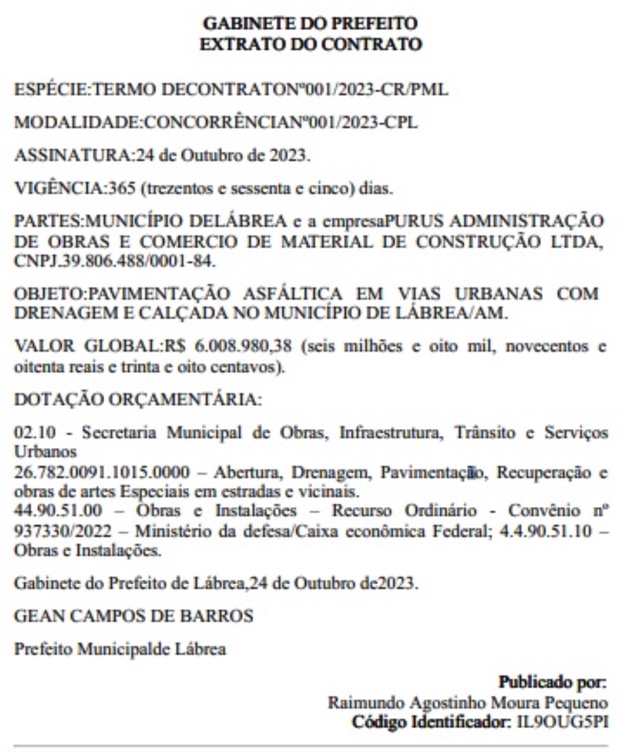 De acordo com o Diário Oficial dos Municípios, da Associação Amazonense dos Municípios (AAM), a Purus Administração de Obras e Comércio de Material de Construção LTDA, sediada em Manaus, foi a empresa escolhida para a execução das obras de pavimentação e construção de calçadas em Lábrea. A escolha de uma empresa localizada em Manaus, que fica a uma distância considerável de Lábrea, já levantou algumas interrogações.