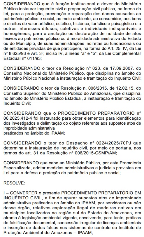 O primeiro golpe veio com a decisão do MP-AM, que converteu o Procedimento Preparatório nº 06.2025.412-4 em Inquérito Civil para investigar um suposto esquema de exploração ilegal de madeira envolvendo servidores do IPAAM. Segundo a Promotoria de Defesa do Patrimônio Público, há fortes indícios de que funcionários do órgão, possivelmente em conluio com agentes externos, tenham falsificado documentos oficiais, inserido dados fraudulentos nos sistemas de controle ambiental, concedido licenças irregulares e autorizado a circulação de madeira extraída ilegalmente em municípios do sul do Amazonas. O Ministério Público afirma que tais práticas configuram, em tese, atos de improbidade administrativa e danos graves ao meio ambiente, além de permitir que redes clandestinas de exploração avançassem sem fiscalização.