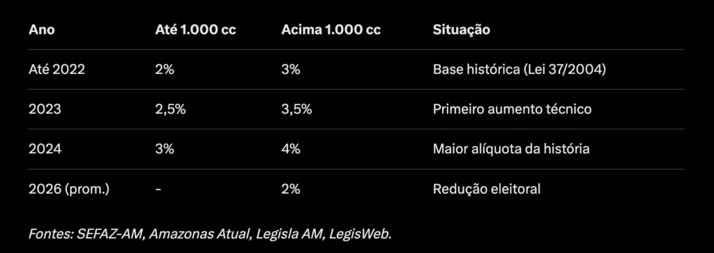 – 2024: 3% e 4%, respectivamente, configurando a maior alíquota da história do Amazonas.