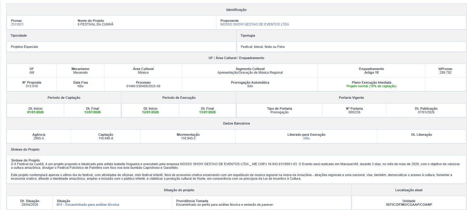 O projeto está autorizado a captar até R$ 3,8 milhões via mecanismo federal de incentivo à cultura. No entanto, dados disponíveis indicam que, até o momento, cerca de R$ 790 mil foram efetivamente captados pela empresa responsável pela organização. O festival tem como proposta valorizar a cultura nortista, reunindo atrações nacionais e regionais, além de funcionar como um “aquecimento” para o Festival de Parintins.