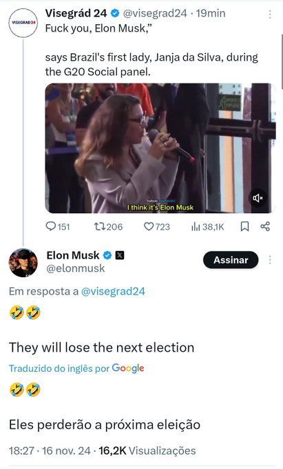Em uma resposta em um tuíte separado, comentou: “eles vão perder a próxima eleição” – em clara referência à próxima eleição presidencial no Brasil, em 2026.