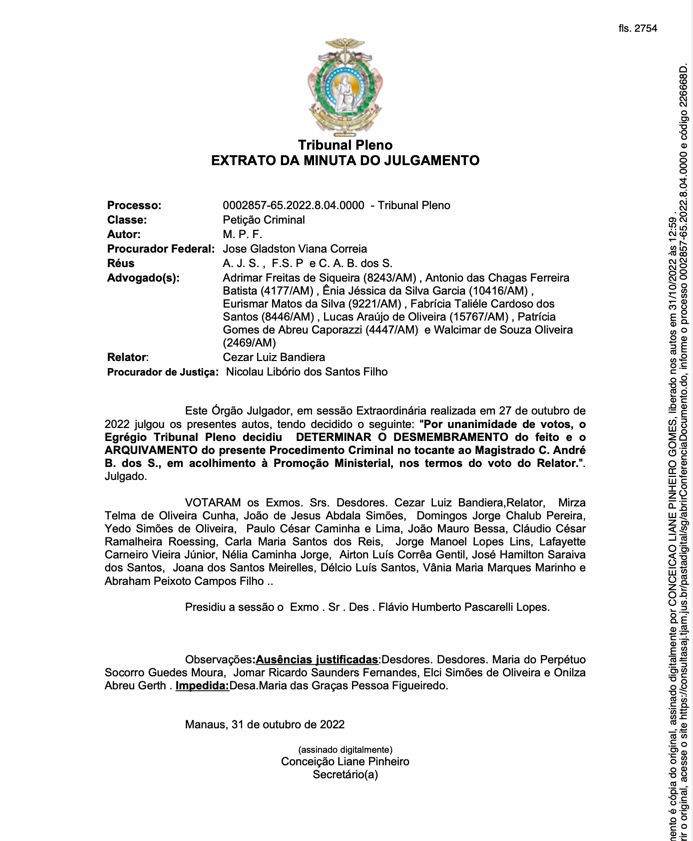 Amazonas – O juiz Cássio André Borges, do Tribunal de Justiça do Amazonas, não está envolvido no caso do desvio de recursos da Previdência de Rio Preto da Eva, conforme esclarecimento do pleno da corte. O tribunal determinou que ele não poderia ter sido denunciado pelo Ministério Público Federal ou pela primeira instância da Justiça Federal, pois o foro adequado para tal denúncia seria o Conselho Nacional de Justiça.
