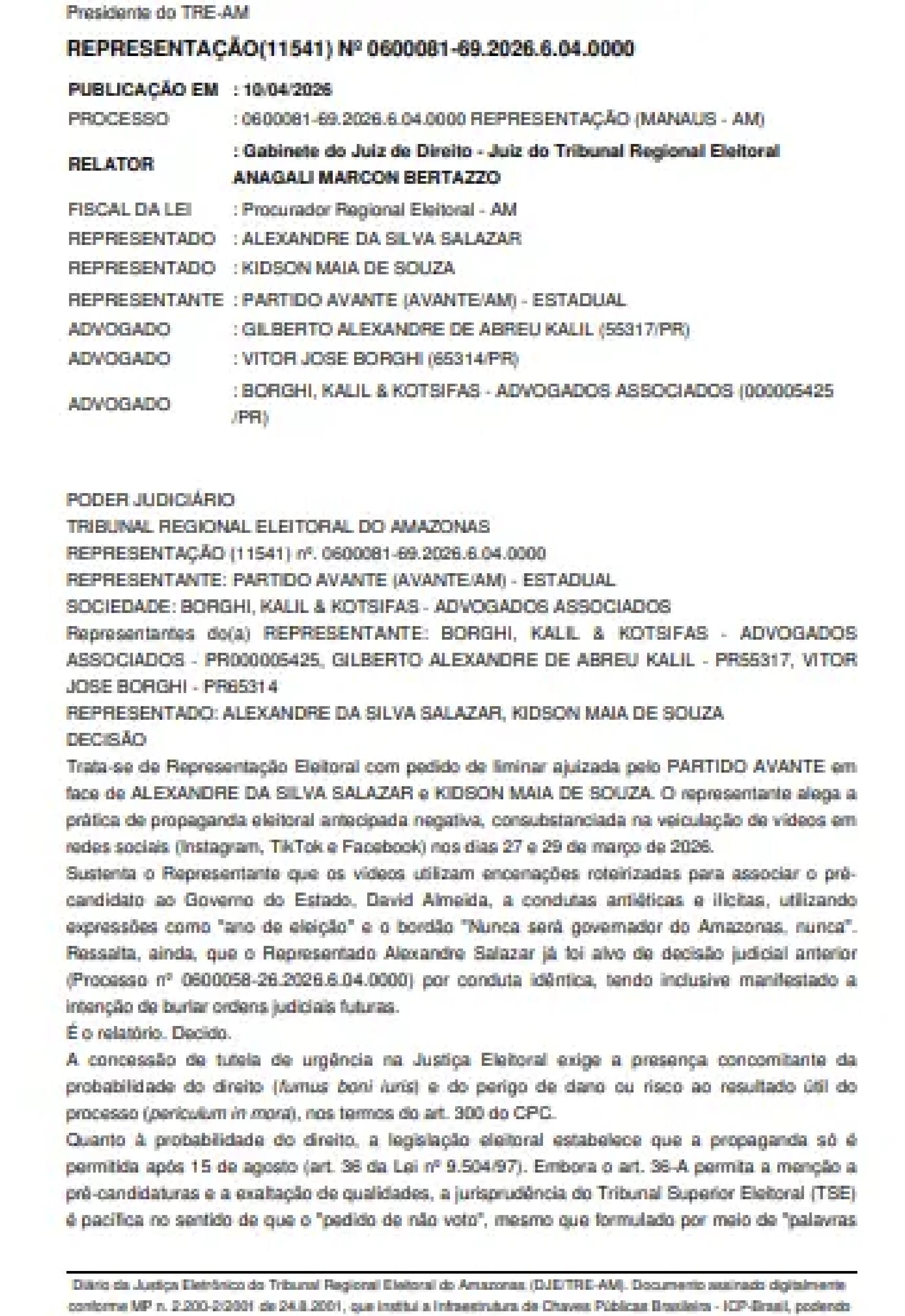 A decisão foi assinada pela juíza Anagali Marcon Bertazzo, do Tribunal Regional Eleitoral do Amazonas (TRE-AM), em resposta a uma representação movida pelo partido Avante. A legenda acusa os envolvidos de prática de propaganda eleitoral antecipada negativa.