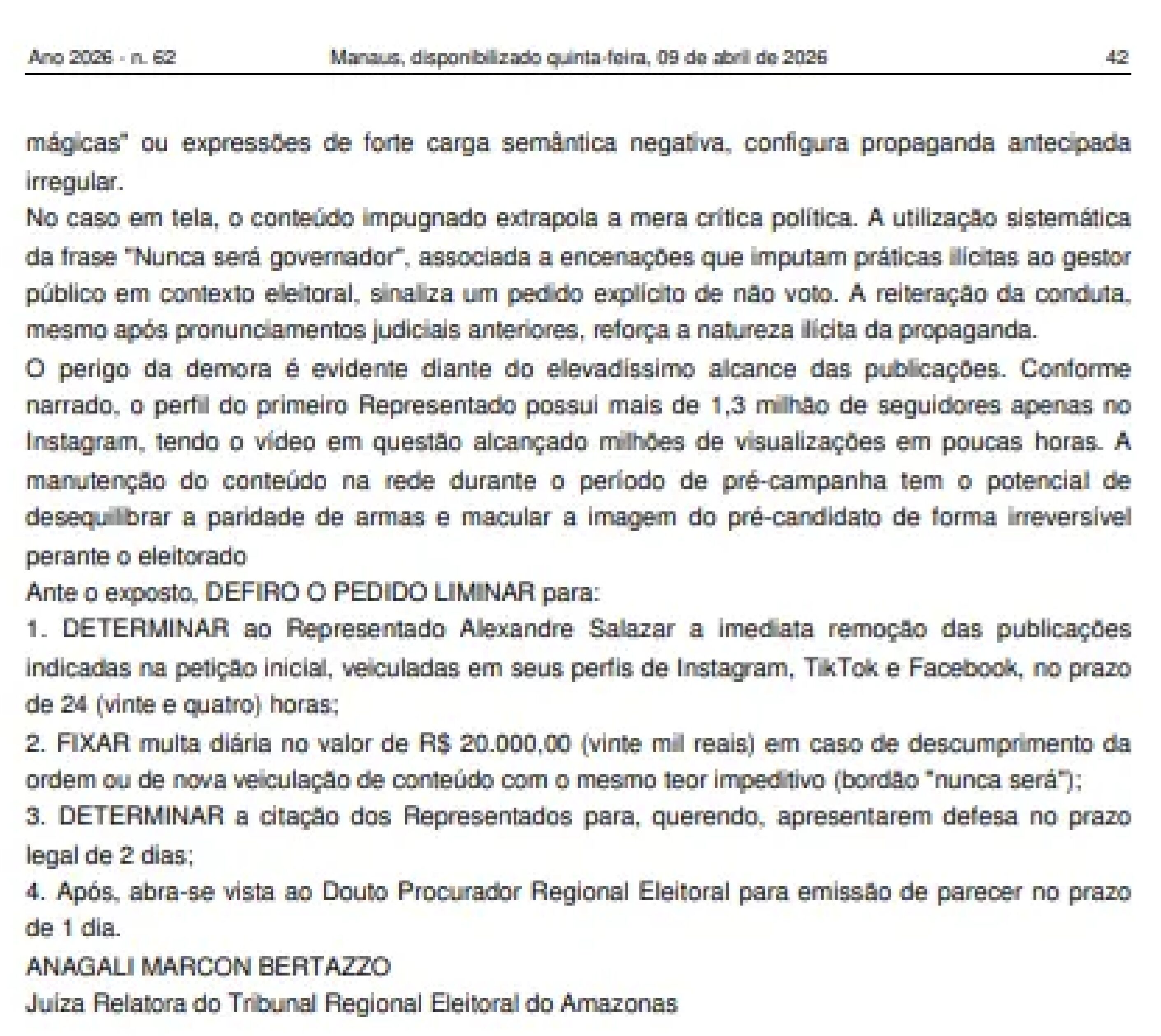 O forte engajamento das publicações também pesou na determinação do TRE-AM. Com mais de 1,3 milhão de seguidores apenas no Instagram, os vídeos de Salazar acumularam milhões de visualizações em um curto período. Para a Justiça, a manutenção do material no ar possui potencial para desequilibrar a disputa eleitoral e causar danos à imagem do pré-candidato.