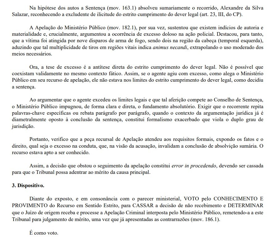 Para o relator, esse argumento vai diretamente contra a justificativa usada para absolver o vereador em primeira instância, que foi a de que ele teria agido dentro da lei. “Se houve excesso, não há como dizer que a ação foi totalmente legal”, resume o entendimento destacado na decisão.