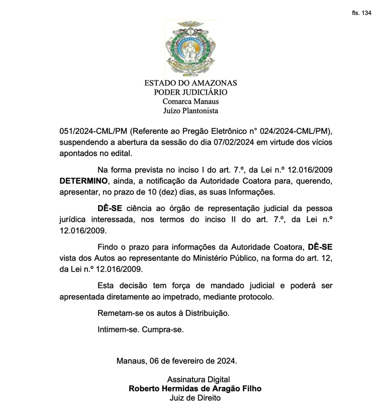 Ainda no mês de janeiro de 2024, o Tribunal de Contas do Estado do Amazonas (TCE-AM) já havia se manifestado sobre o caso, acatando um pedido cautelar da conselheira-presidente Yara Lins, que determinou a suspensão do pregão eletrônico até que o mérito da representação fosse julgado. Yara Lins considerou os argumentos apresentados pelos requerentes, entre eles a falta de transparência e a impossibilidade de participação de diversas empresas do ramo devido a requisitos específicos estabelecidos no edital.