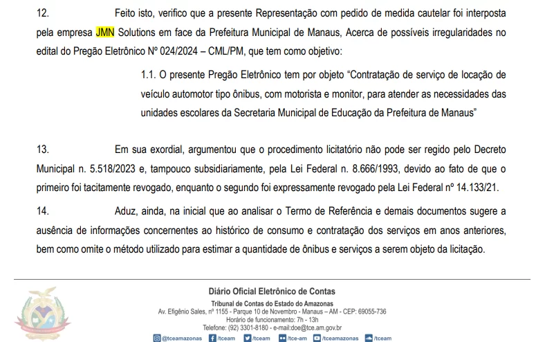 No entanto, com a volta do recesso, os autos foram distribuídos ao conselheiro Érico Desterro e Silva, que revogou a Medida Cautelar concedida anteriormente pela presidente do TCE, retomando os efeitos do Pregão Eletrônico nº 0024/2024-CML/PM da Secretaria Municipal de Educação da Prefeitura de Manaus, o que acabou gerando mobilização da empresa JMN Solutions e o representante por Claudiomar de Souza Pinto.O pedido cautelar protocolado por eles, apontaram o uso de um decreto e uma lei já revogados como base para o procedimento, bem como a falta de informações sobre a contratação de serviços em anos anteriores.