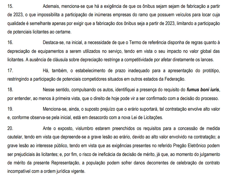 Os representantes pontuam ainda que a Secretaria de Educação Municipal “omite o método utilizado para estimar a quantidade de ônibus e serviços a serem objeto da licitação”. Outro ponto questionado é de que os ônibus sejam de fabricação a partir de 2023, “o que impossibilita a participação de inúmeras empresas do ramo que possuem veículos para” locação, mesmo que sejam fabricados em anos anteriores.