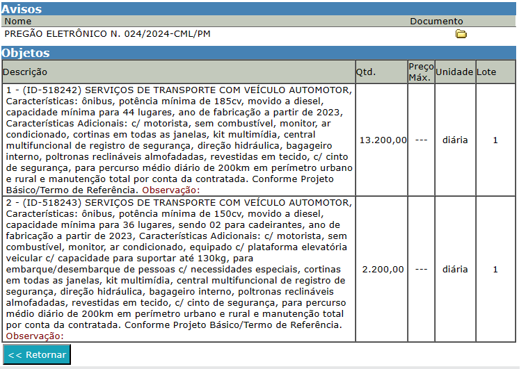 Segundo o portal Compras Manaus, os objetos tratam-se de dois ônibus de 44 lugares e 36 lugares, os quais terão pagamento diário máximo de R$ 13,2 mil e R 2,2 mil, respectivamente, os quais devem atender escolas municipais na zona rural da capital amazonense. O valor global da licitação ainda não foi disponibilizado por estar em fase de apresentação de propostas.