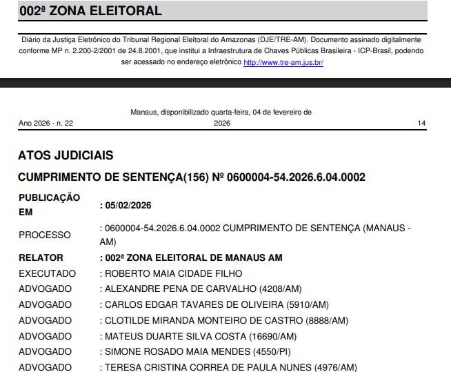 O Poder Judiciário do Amazonas deu início ao processo de execução de multa eleitoral contra o parlamentar, após o trânsito em julgado de uma condenação que já não admite qualquer tipo de recurso. A decisão foi publicada no Diário da Justiça Eletrônico desta quarta-feira (04/02) e integra o processo de cumprimento de sentença nº 0600004-54.2026.6.04.0002.