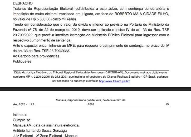 Seguindo o que determina a Resolução TSE nº 23.709/2022, o magistrado determinou a intimação imediata do Ministério Público Eleitoral (MPE), que agora assume o papel de exequente da ação. Na prática, caberá ao MPE solicitar que Roberto Cidade efetue o pagamento do débito aos cofres públicos, encerrando uma pendência que sobreviveu ao fim da campanha.