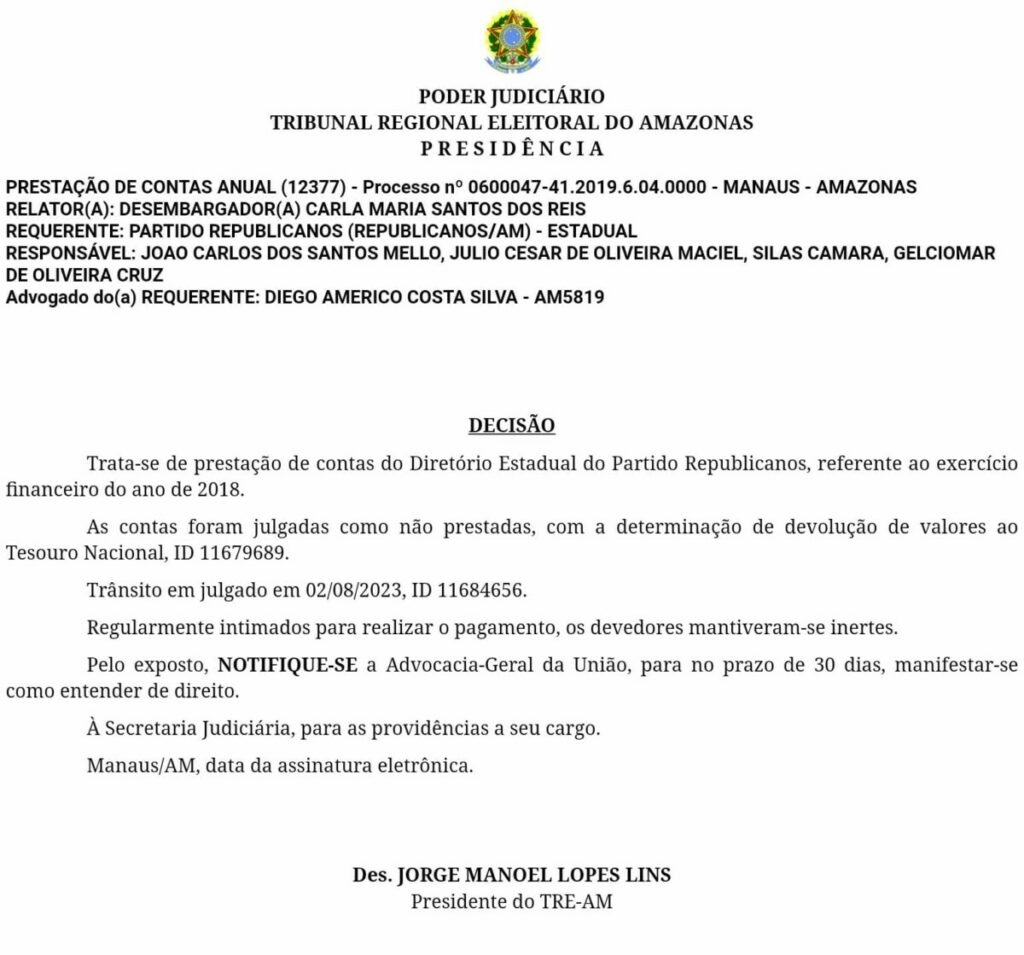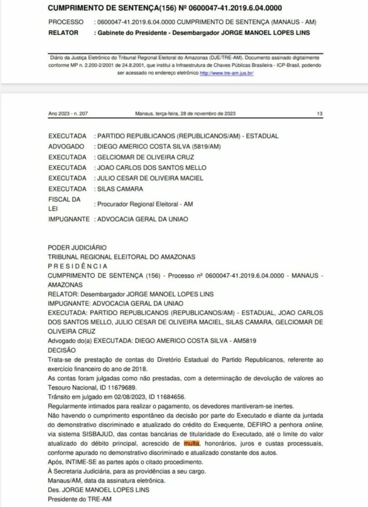 No documento, todos os executados, incluindo o deputado federal Silas Câmara que comanda o Diretório Estadual, também foram inclusos na decisão até a quitação do débito principal, acrescido de multas, honorários, juros e custas processuais.