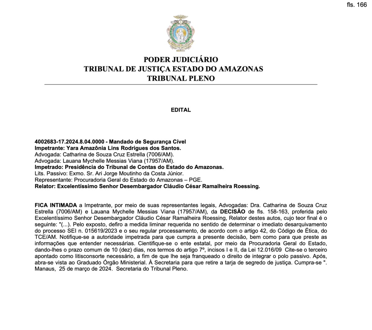 Em 27.03.2024 o Tribunal de Justiça do Amazonas publicou no diário oficiaL, decisão do Desembargador Cláudio Roessing que concedeu liminar em mandado de segurança n. 4002683-17.2024.8.04.0000 para determinar o desarquivamento do processo administrativo em face de Ari Jorge Moutinho da Costa Júnior para que respondesse por seu ato nos termos do Código de Ética.