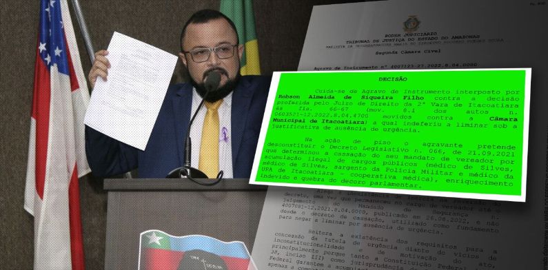 A nova decisão que suspende primeira ação por quebra de decoro por acúmulo de cargos públicos é da desembargadora Maria do Perpétuo Socorro Guedes que afirma não ter identificado prejuízos no exercício parlamentar. Antes de ser eleito como vereador, Robson Siqueira já atuava como médico em unidades da saúde da prefeitura de Silves e do governo do AM. Ele também mantinha patente de sargento da Polícia Militar, hoje na reserva.