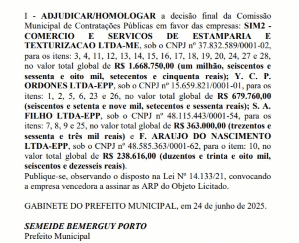 A contratação está respaldada em processo licitatório, conforme previsto em lei, e foi publicada oficialmente no DOM.