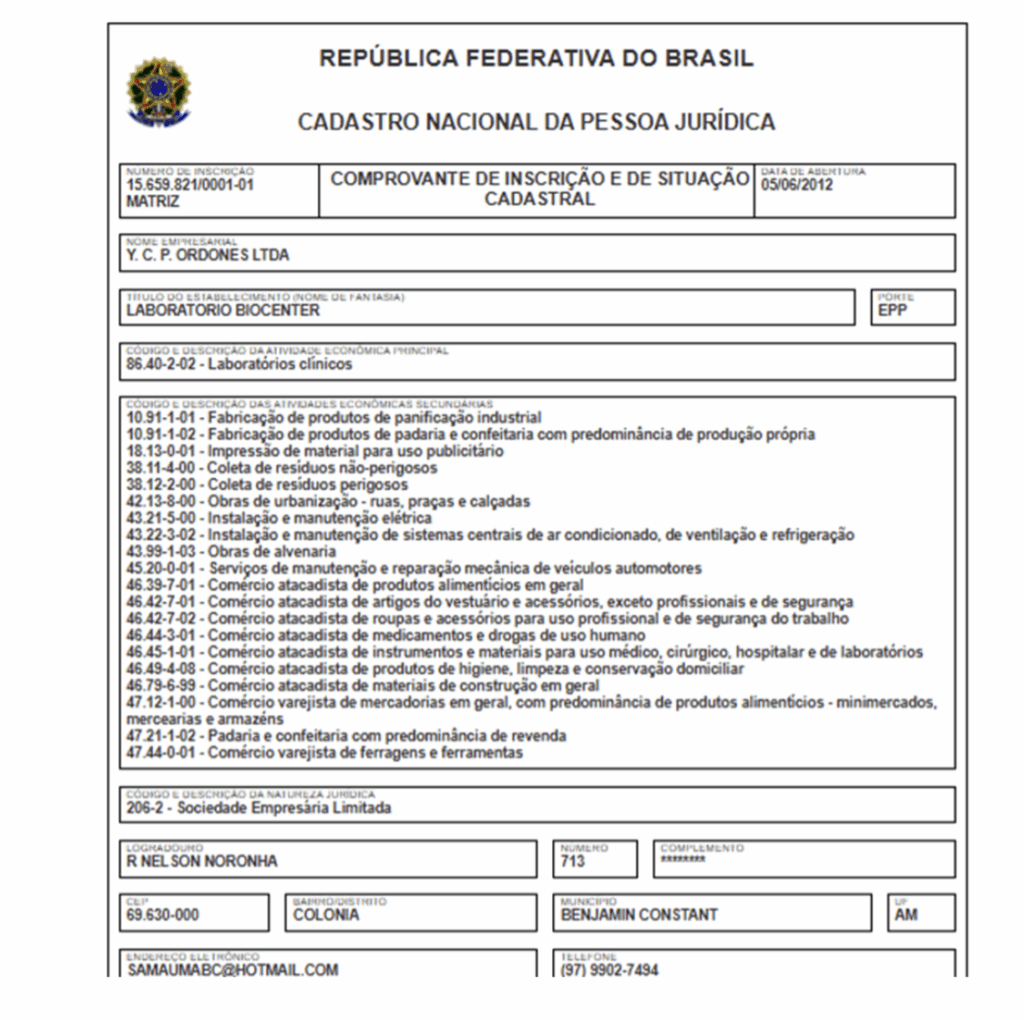 Y.C.P. Ordones LTDA-EPP, nome fantasia Laboratório Biocenter, cuja principal atividade registrada é laboratório clínico, com atividades secundárias diversas, incluindo produtos alimentícios e coleta de resíduos;