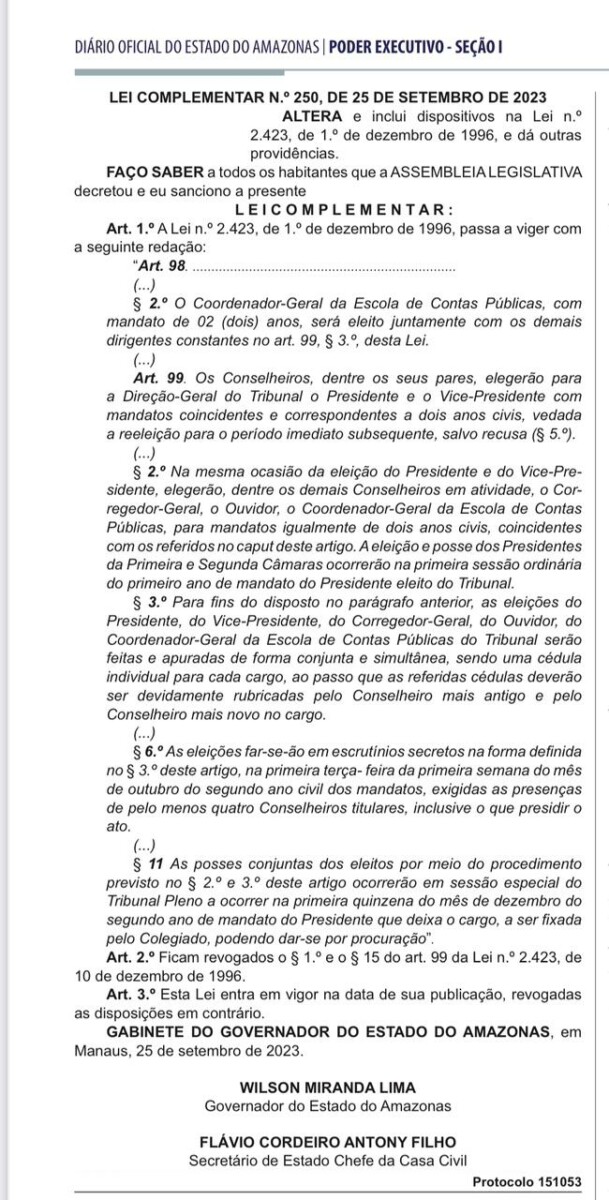 Manaus – O governador do Estado do Amazonas, Wilson Lima, da União Brasil, sancionou integralmente na noite da última terça-feira (25) a lei aprovada pela Assembleia Legislativa do Estado do Amazonas (Aleam) que traz alterações significativas ao regimento interno do Tribunal de Contas do Estado do Amazonas (TCE AM).