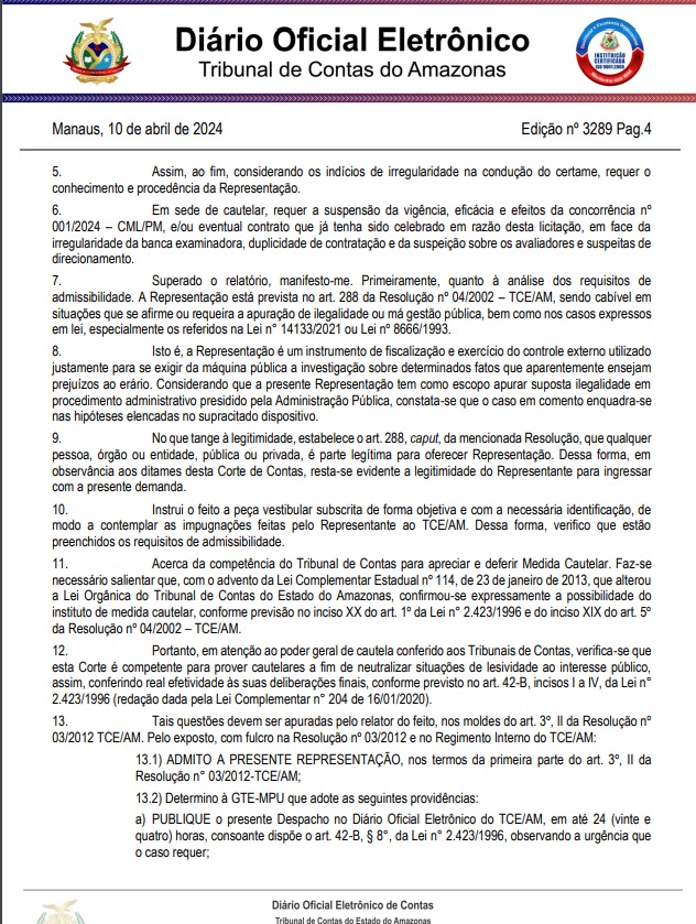 O conselheiro Fabian Barbosa, relator do processo, determinou a suspensão imediata da licitação, concedendo um prazo de 24 horas para sua interrupção, dada a urgência do caso. A medida foi tomada após a Representação com pedido de Medida Cautelar interposta por Lidiana de França Martins, que solicitou a apuração de possíveis irregularidades relacionadas à Concorrência nº 001/2024/Cml/pm.