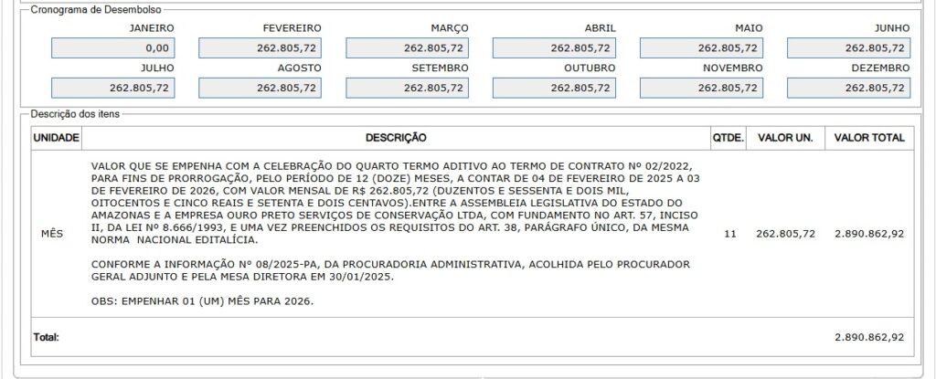 Segundo informações disponíveis na transparência do Poder Legislativo, o novo período de prestação de serviços teve início em 4 de fevereiro de 2025 e está programado para se encerrar em 3 de fevereiro de 2026. Pelo contrato, a Ouro Preto receberá mensalmente o valor de R$ 262.805,72, totalizando R$ 2.890.862,92 ao final do período.