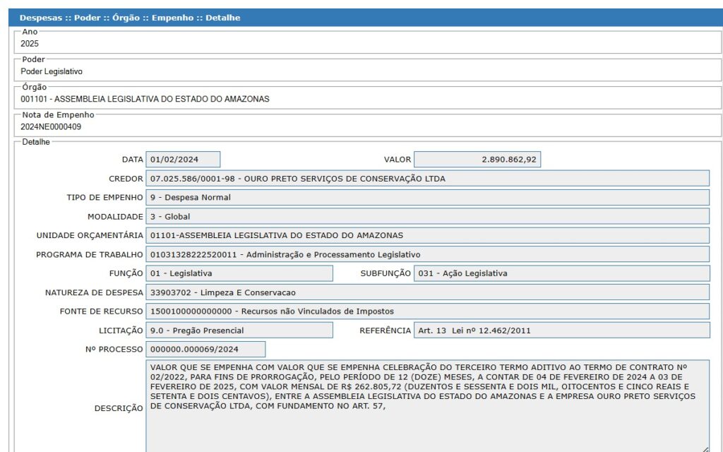 Amazonas – A Assembleia Legislativa do Estado do Amazonas (Aleam), presidida pelo deputado estadual Roberto Cidade (UB), renovou pela terceira vez o contrato de serviços de limpeza de sua estrutura com a empresa Ouro Preto Serviços Conservação Ltda., que acumula diversas denúncias em processos trabalhistas relacionados a condições de insalubridade. A prorrogação, formalizada por meio do quarto Termo Aditivo do Contrato nº 02/2022, prevê o pagamento de quase R$ 3 milhões dos cofres públicos à empresa ao longo de 12 meses.
