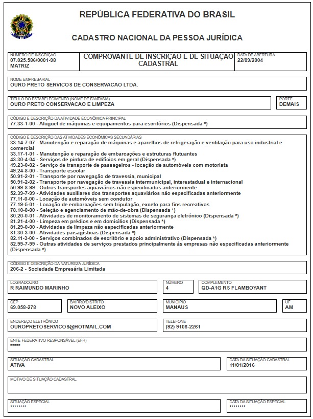 De acordo com a Receita Federal, a Ouro Preto Conservação e Limpeza está no mercado desde 2002 e tem como atividade econômica principal o aluguel de máquinas e equipamentos para escritórios, embora também atue no setor de serviços de limpeza. A sede da empresa está localizada no bairro Novo Aleixo, em Manaus.