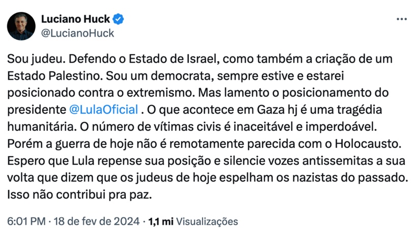 O embate começou quando Lula expressou sua opinião sobre o conflito na região, afirmando que as ações de Israel em Gaza não podem ser comparadas ao Holocausto. O apresentador Luciano Huck se manifestou, lamentando a fala de Lula e ressaltando que o conflito em Gaza é uma tragédia humanitária, mas não se assemelha ao Holocausto. Ela disse ter sensibilizado porque também é judeu. Veja: