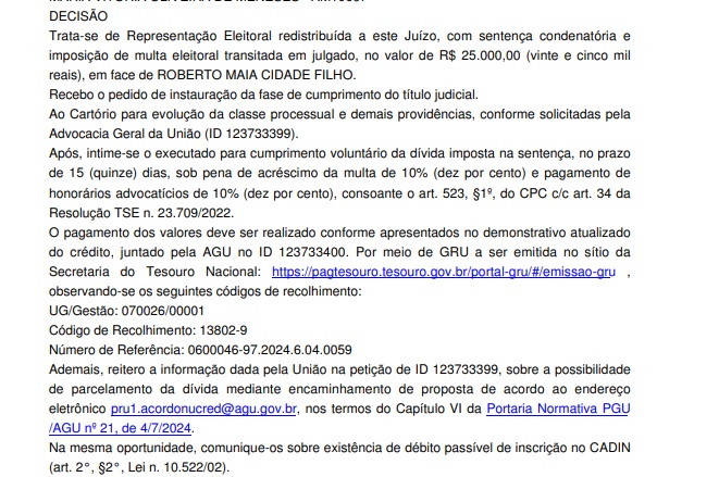 O montante deve ser pago via Guia de Recolhimento da União (GRU) em até 15 dias. Caso o pagamento não ocorra, a dívida terá acréscimo de 10% de multa e mais 10% de honorários advocatícios. A decisão, assinada pelo juiz Antônio Itamar de Sousa Gonzaga, prevê medidas coercitivas, incluindo penhora online de contas bancárias, restrição de veículos e inscrição do nome de Cidade nos cadastros de inadimplentes (SERASA e CADIN).
