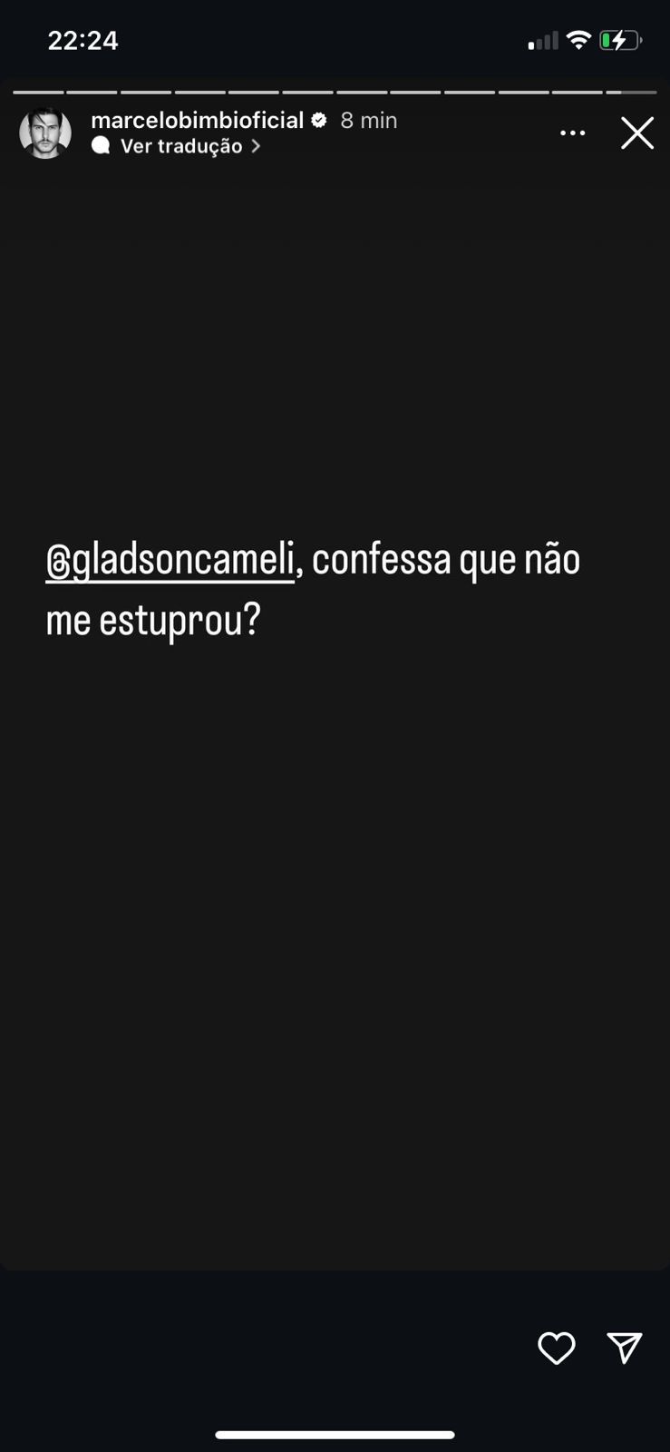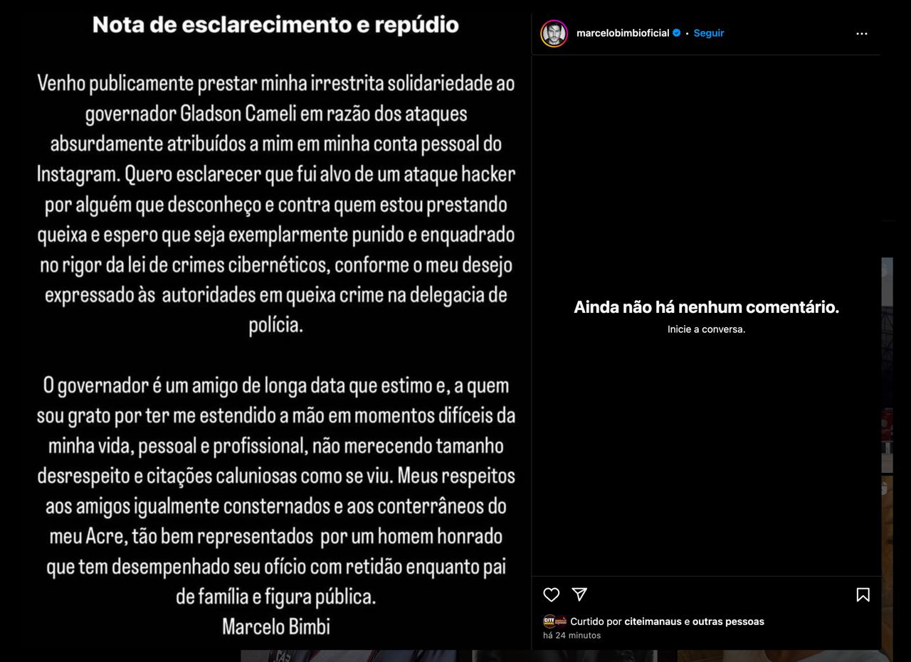 Brasil – Marcelo Bimbi postou uma mensagem em seu perfil no Instagram na tarde de hoje relatando que seu perfil no Instagram foi invadido por hackers. Antes, uma mensagem compartilhada na rede social acusava o governador do Acre, Gladson Cameli, de um suposto abuso sexual contra o ator e modelo.