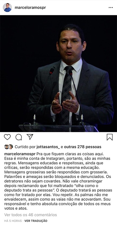 Ramos, que atualmente preside a Comissão Especial da Reforma da Previdência, ainda alegou que “palavrões e ameaças serão bloqueados e denunciados e chamou os autores dos comentários inapropriados de “detratores”. “Os detratores não sejam covardes. Não vale choramingar depois reclamando que foi maltratado ‘olha como o deputado trata as pessoas’”, escreveu Ramos, com alguns erros de pontuação.