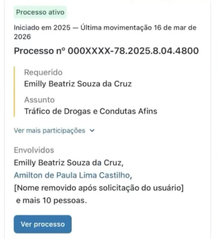 Em 2023, Emilly foi alvo de um mandado de prisão preventiva expedido pela Vara de Itamarati do Tribunal de Justiça do Amazonas (Processo nº 0600369-10.2023.8.04.4800). Ela foi enquadrada no artigo 33, § 1º, da Lei 11.343 (Lei de Drogas), que tipifica condutas como produção e preparo de entorpecentes. No mesmo processo, figura o nome de seu marido, Francisco de Paulo de Lima Castilho, conhecido como “Pacu”, que atualmente encontra-se foragido da Justiça.