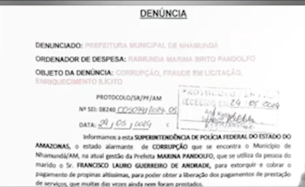 A denúncia, datada de 24 de maio de 2024, diz que Marina Pandolfo, através de seu marido, Francisco Lauro Guerreiro de Andrade, estaria extorquindo e cobrando propinas elevadas para liberar pagamentos por serviços muitas vezes não realizados. Essa prática, segundo a denúncia, configura um estado alarmante de corrupção na gestão atual da Prefeitura de Nhamundá.