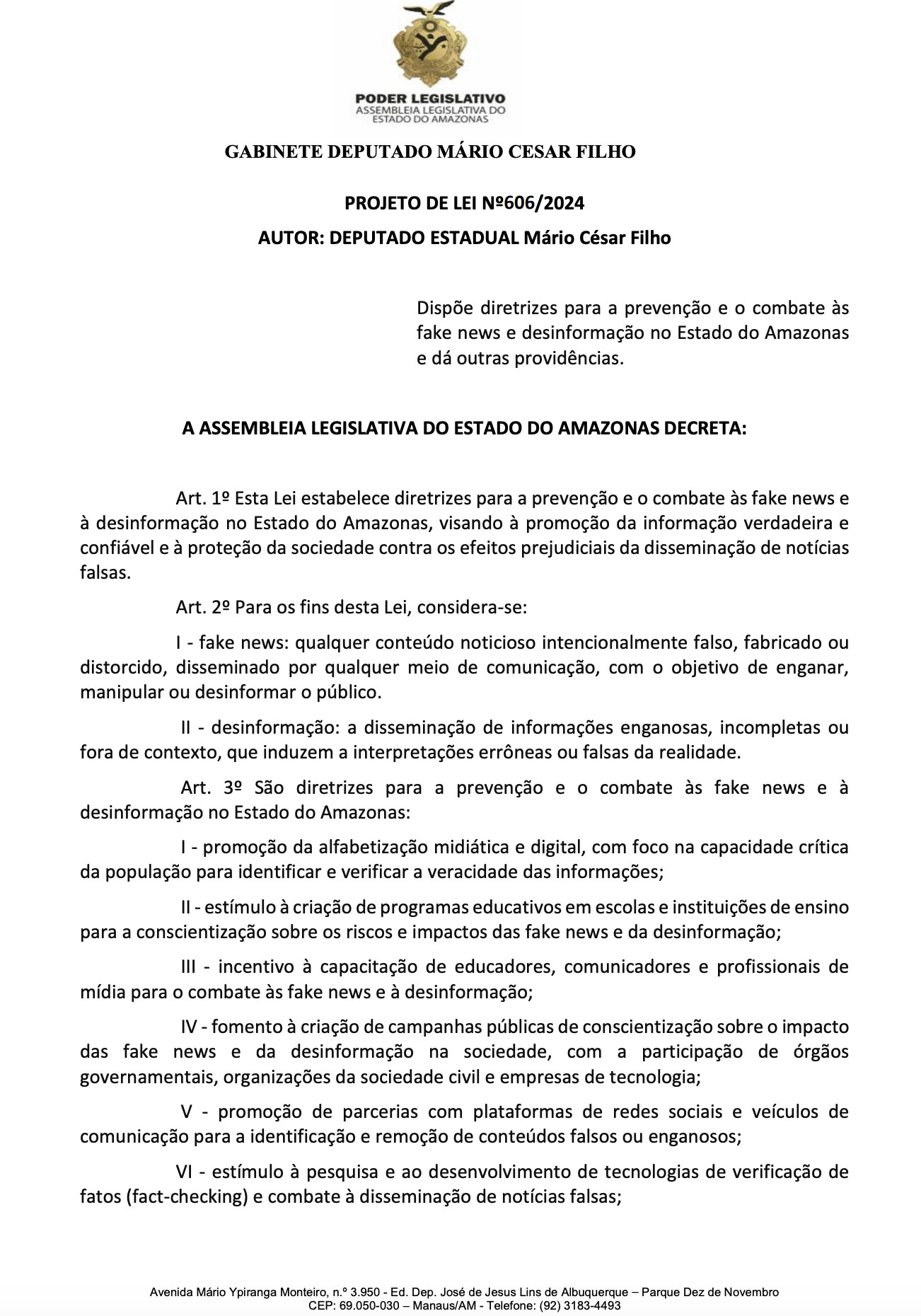 Amazonas – Sob o pretexto de combater fake news, o deputado estadual Mário César Filho (União Brasil) apresentou na Aleam o Projeto de Lei nº 606/2024, uma proposta que mais parece manual de controle da informação. Com discurso bonito e palavras-chave da moda, o texto abre uma brecha perigosa para o Estado decidir o que é verdade e o que é mentira no Amazonas.