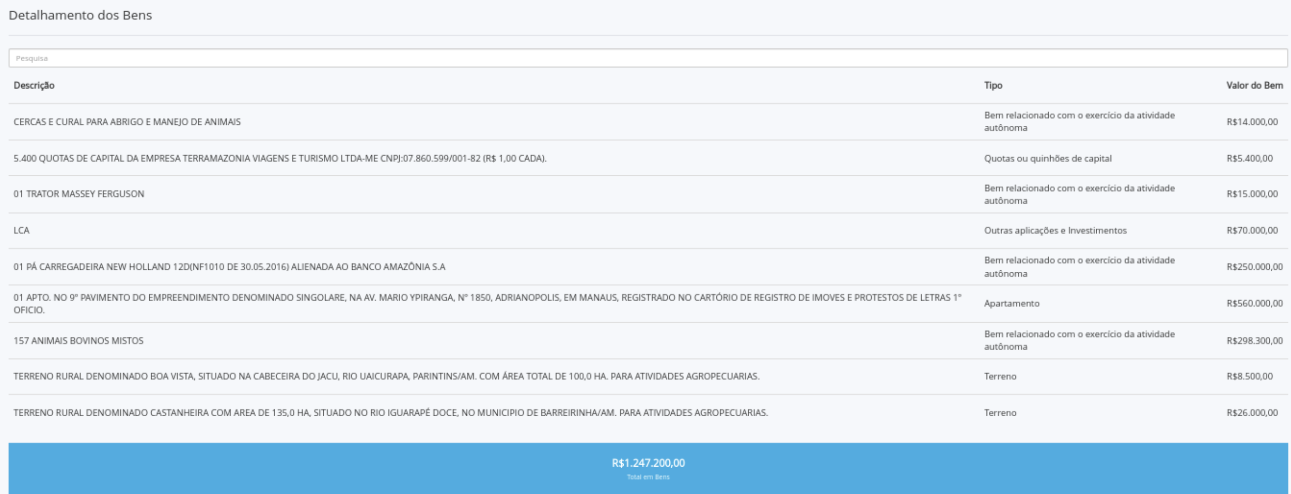 Uma análise mais detalhada revela que esse crescimento exponencial está vinculado a diversas aquisições significativas ao longo dos anos. Entre elas, destaca-se a compra de um apartamento no bairro Adrianópolis, na Zona Centro-Sul de Manaus, além de investimentos na criação de animais bovinos, no valor de R$ 298.300,00, e a aquisição de uma pá carregadeira New Holland 12D, utilizada em obras.
