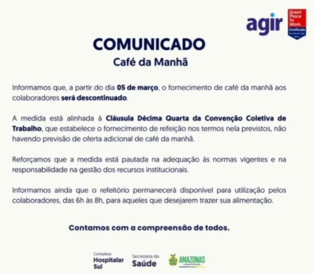 No documento, a empresa goiana justifica o fim do desjejum alegando “responsabilidade na gestão dos recursos institucionais” e afirma que a decisão está alinhada à Cláusula Décima Quarta da Convenção Coletiva de Trabalho. Segundo a nota da direção, a convenção garante o fornecimento de refeição, mas “não havendo previsão de oferta adicional de café da manhã”.