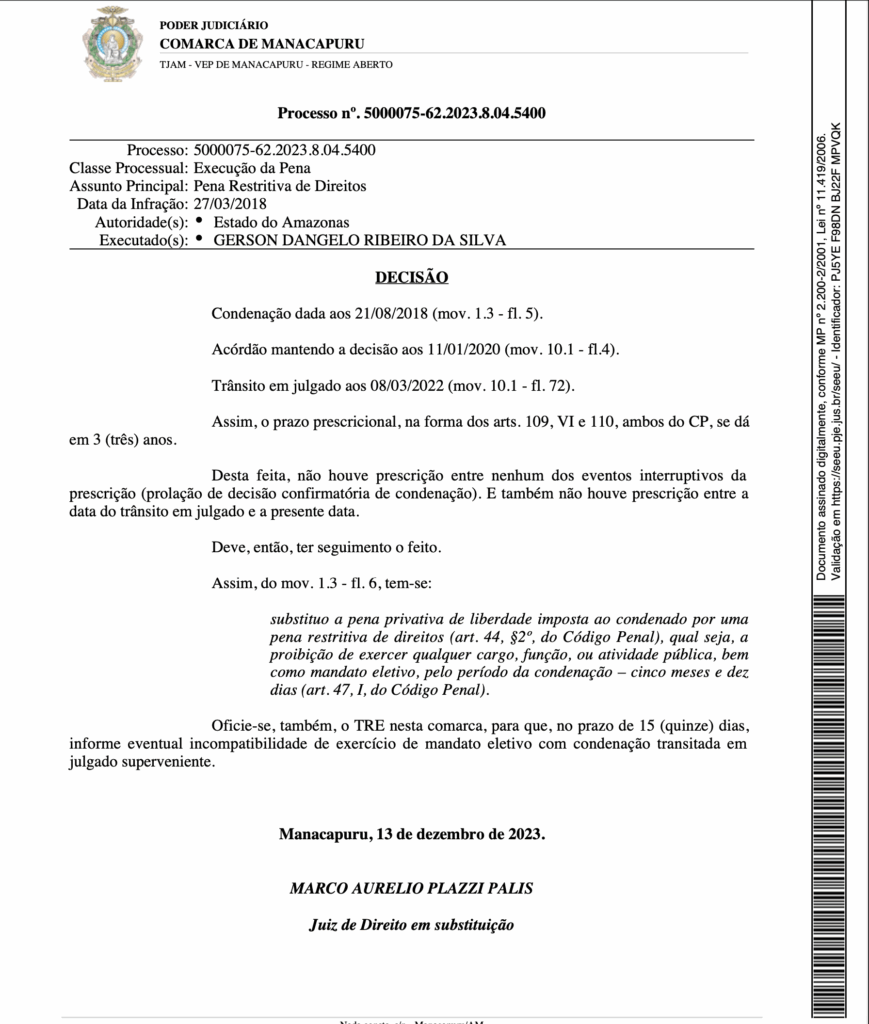 Amazonas – O vereador Gerson D’Ângelo Ribeiro da Silva voltou ao centro das discussões políticas no município após virem à tona informações sobre sua condenação criminal, transitada em julgado em março de 2022. Na ocasião, a Justiça substituiu a pena de prisão por restrição de direitos, proibindo-o de exercer qualquer função pública ou mandato eletivo pelo período de cinco meses e dez dias.