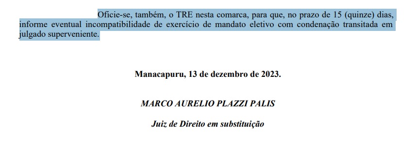 A situação se tornou ainda mais delicada em dezembro de 2023, quando a Justiça determinou que o caso fosse comunicado ao Tribunal Regional Eleitoral (TRE) e à Câmara Municipal de Manacapuru, para análise da compatibilidade entre a condenação e a função pública. Até hoje, porém, a decisão não foi cumprida, sem explicações sobre os motivos da demora.