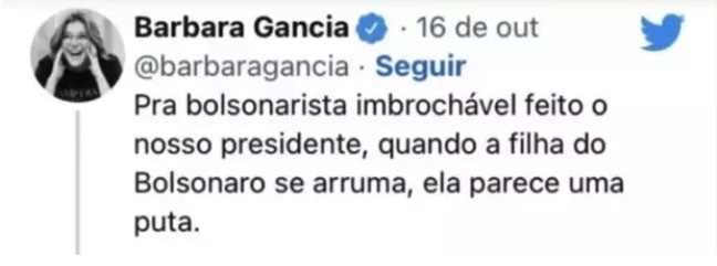 “Pra bolsonarista imbrochável feito o nosso presidente, quando a filha do Bolsonaro se arruma, ela parece uma p**a”, escreveu.