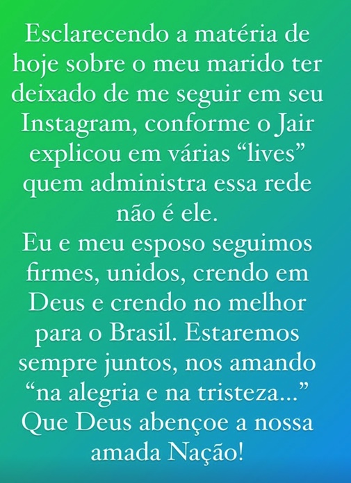 Michelle também esclareceu o Unfollow no Instagram. “Esclarecendo a matéria de hoje sobre meu marido ter deixado de me seguir em seu Instagram, conforme o Jair explicou em várias lives quem administra essa rede não é ele”.