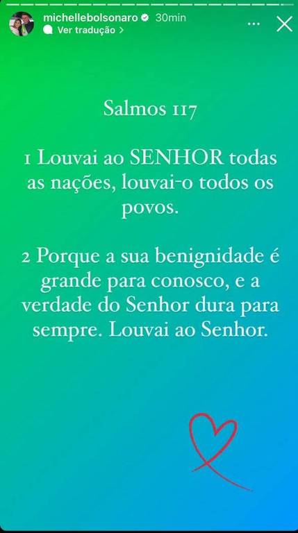 “Salmos 117. Louvai ao Senhor todas as nações, louvai-o todos os povos. Porque a sua benignidade é grande para conosco, e a verdade do Senhor dura para sempre. Louvai ao Senhor”, escreveu Michelle no Instagram.