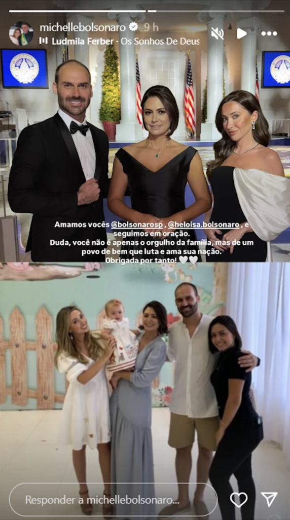 Brasil – A ex-primeira-dama Michelle Bolsonaro declarou, nesta terça-feira (18), em seu perfil no Instagram, que está em oração pelo deputado federal Eduardo Bolsonaro (PL-SP) e sua esposa, Heloísa Bolsonaro, após o parlamentar anunciar sua licença do cargo na Câmara para permanecer nos Estados Unidos em um exílio político forçado. Em uma mensagem de apoio, Michelle escreveu: “Amamos vocês, Eduardo Bolsonaro e Heloísa Bolsonaro, e seguimos em oração. Duda, você não é apenas o orgulho da família, mas de um povo de bem que luta e ama sua nação. Obrigada por tanto!”, destacando a solidariedade familiar diante da decisão que tem agitado o cenário político brasileiro.