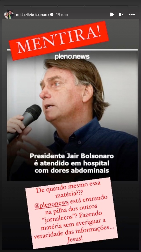 Brasil – A primeira-dama Michelle Bolsonaro foi às redes sociais para negar a informação de que o presidente Jair Bolsonaro teria dado entrada no Hospital das Forças Armadas, por conta de fortes dores abdominais, na manhã desta sexta-feira (18).Na ocasião ela advertiu o jornal conservador Pleno News que replicou uma fake news da grande mídia sobre o estado de Saúde do marido.